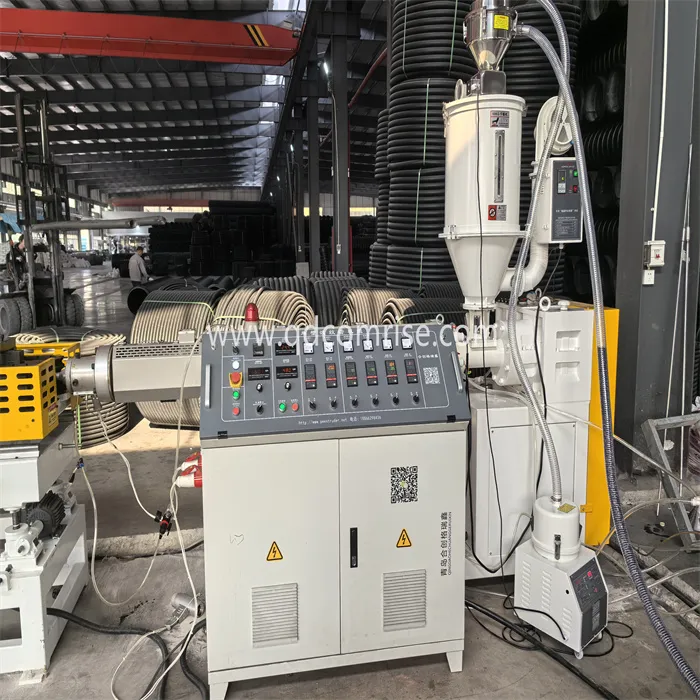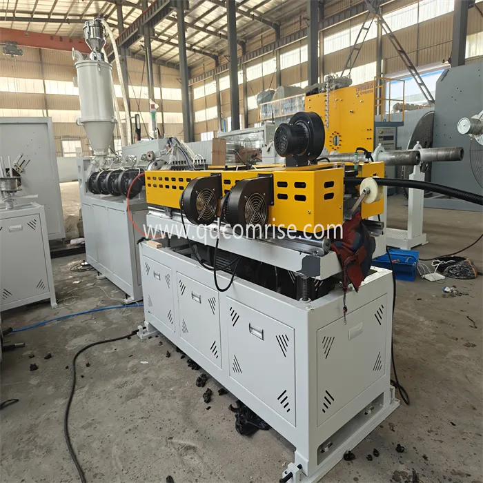ท่อเข้าสู่ corrugator ซึ่งมีรูปร่างเป็นรูปลูกฟูกโดยใช้บล็อกแม่พิมพ์และความดันสูญญากาศ
