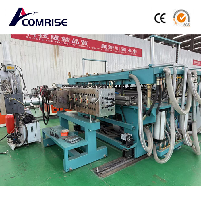 เครื่องบอร์ด PP Hollow ประกอบด้วยเครื่องอัดรีดสกรูเดี่ยวตัวเปลี่ยนหน้าจอไฮดรอลิก, แม่พิมพ์, เครื่องรูปร่าง, เครื่องลากหลัก, เตาหลอม, กล่องระบายความร้อน, เครื่องจักรดึงที่สอง, เครื่องตัดข้ามและสายพานลำเลียง